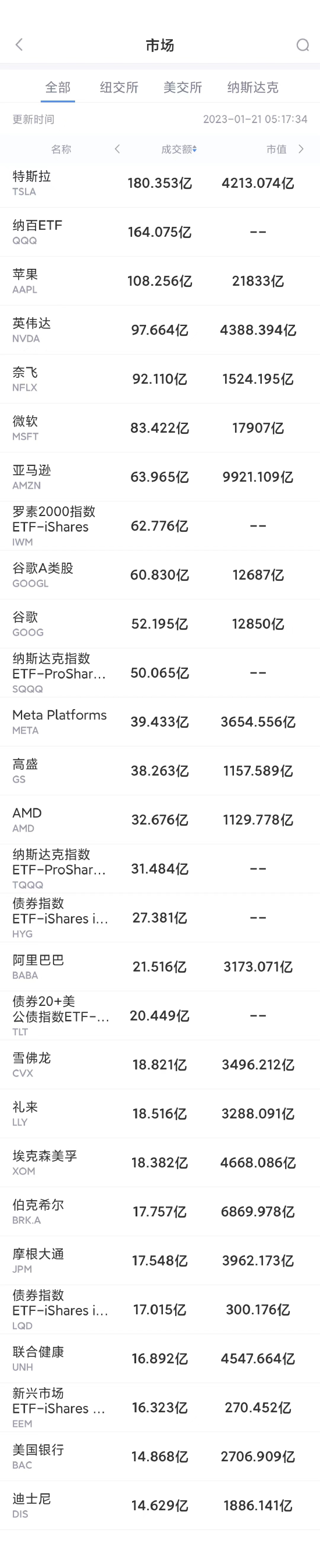 以下为美股当日交易最活跃的20只股票(按成交额):